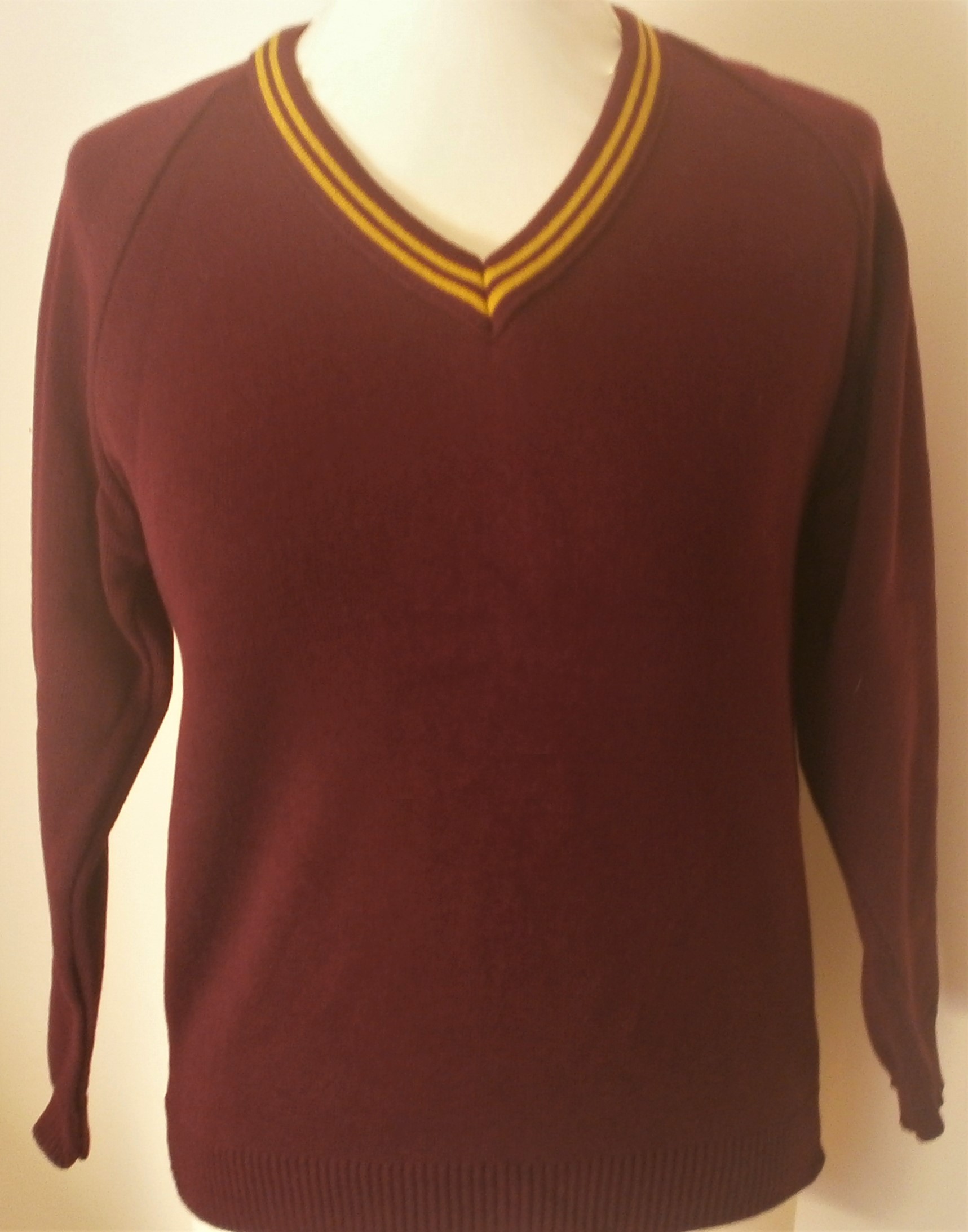 Maroon V Neck knitted jumper with gold stripes on neck.