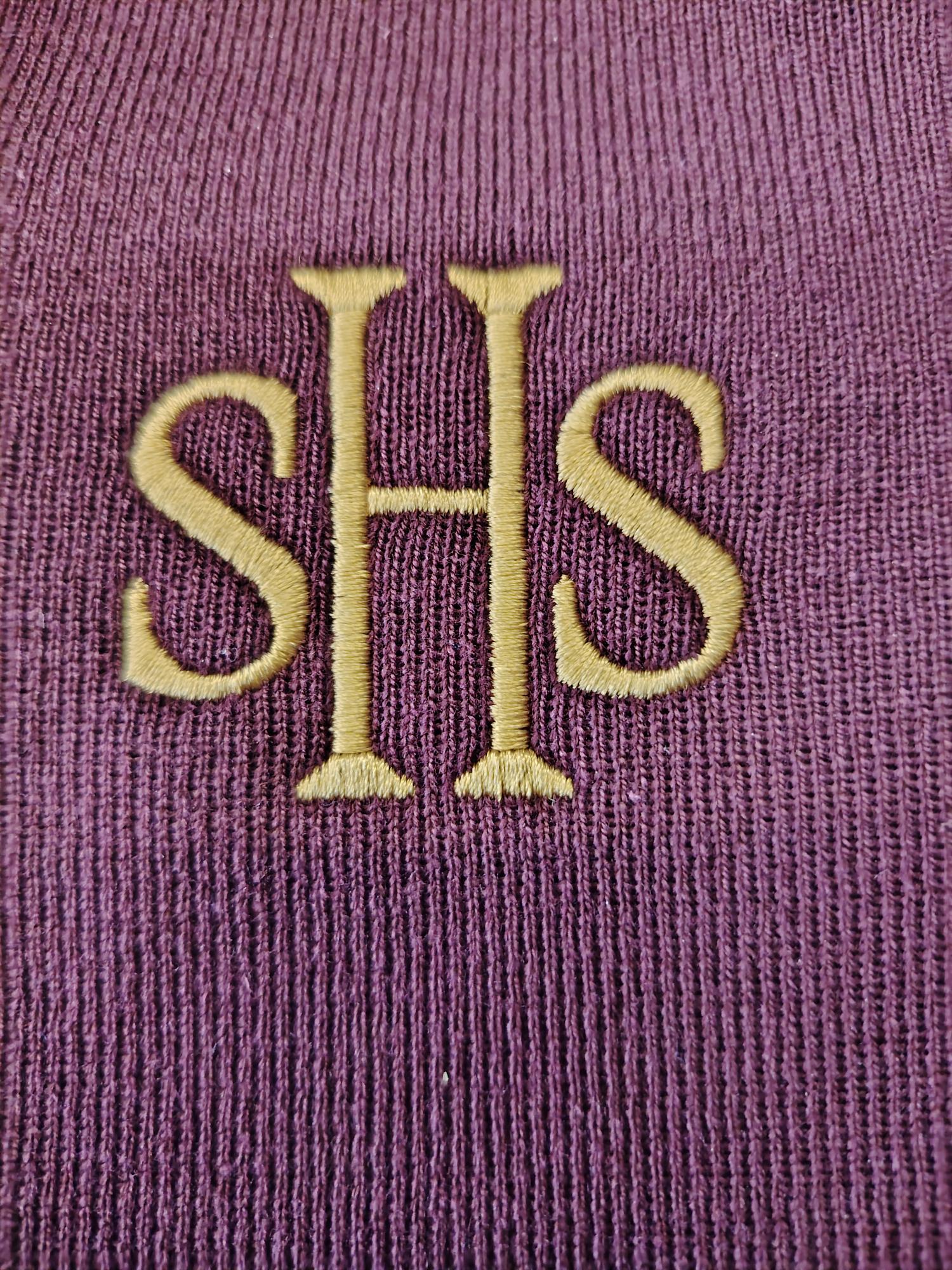 Maroon V Neck knitted jumper with gold stripes on neck and embroidered logo.
